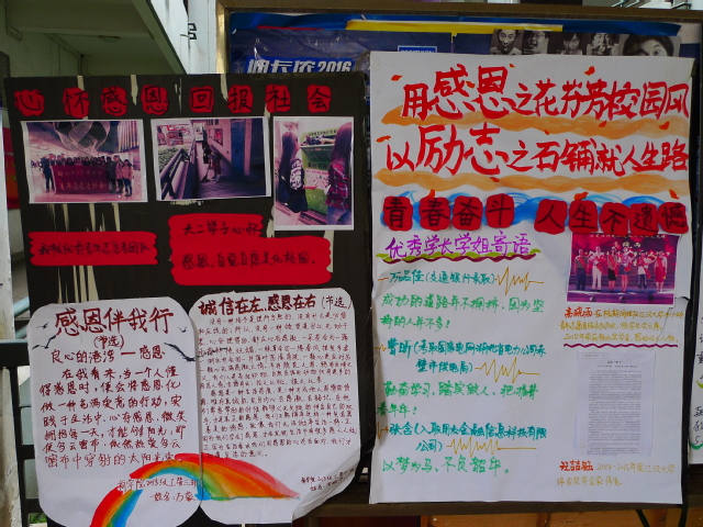 为办好“活动月”,增强活动效果,学生资助管理中心围绕“感恩于心,诚信于行,励志于人”活动主题,周密部署,设计活动方案,组织开展了形式多样、内容丰富的系列教育活动,包括“国家资助助我飞翔”主题征文比赛,“谁的青春不奋斗”主题演讲比赛,“励志有我,诚信先行”资助政策及诚信教育知识竞赛,“爱在江大、心怀感恩”板报评比活动,“怀感恩的心,做诚信的人”影片展播,“诚信贷款,守信还贷”生源地信用助学贷款主题教育活动,“青春榜样,你我一样”优秀大学生先进事迹报告会,“诚信感恩,青春无悔”主题班会,资助政策问卷调查等一系列活动。除此之外,各学院还结合了自身学院特点,开展独具特色的宣传活动,如教育学院的“让梦想点亮芳华”微电影摄制大赛,音乐学院的“感恩的心”歌曲大赛,美术学院的“感恩江大”书画展,法学院的“回馈社会、奉献育人”校内外普法活动,护理学院的“感恩奉献、雷锋精神”急救演练,机建学院的“感恩母校”毕业生植树活动,商学院、法学院、生命科学学院开展的“回馈社会、奉献育人”自愿服务等等。旨在通过弘扬中华民族优秀传统文化,增强学生诚信和感恩意识,培养学生的社会责任感,激励更多贫困学生积极进取、自立自强、成长成才。