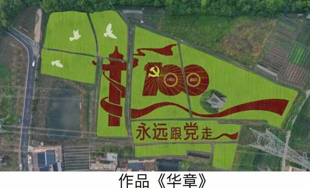 五彩水稻项目是由生命科学学院与武汉铜兴公司旗下武汉七色稻农业科技发展有限公司共同探索农业发展的一条新思路,将科学技术与农业发展相结合,由生命科学学院师生科研团队将选育出的紫、白、绿、黄等多色水稻,设计出华章初心两幅稻田艺术景观作品,在蔡甸计家台科创园和蔡甸街西屋台村后官湖花木产业基地分片种植,面积共计40亩。华章以中华古老华表为主景观,一条代表着中国共产党的红色丝带下是永远跟党走几个大字和金黄色的党徽,几只代表和平的白鸽在华表上空翩翩起舞,寓意在中国共产党的领导下,中华民族必将谱写出新的华章,实现中华民族伟大复兴的中国梦。初心则以不忘初心、牢记使命”8个字作为该作品的主体,彰显出中国共产党风雨百年路的本心与基石,字的上方是一面巨大的党旗,寓意党在新时代继续引领着伟大祖国走向繁荣和富强。