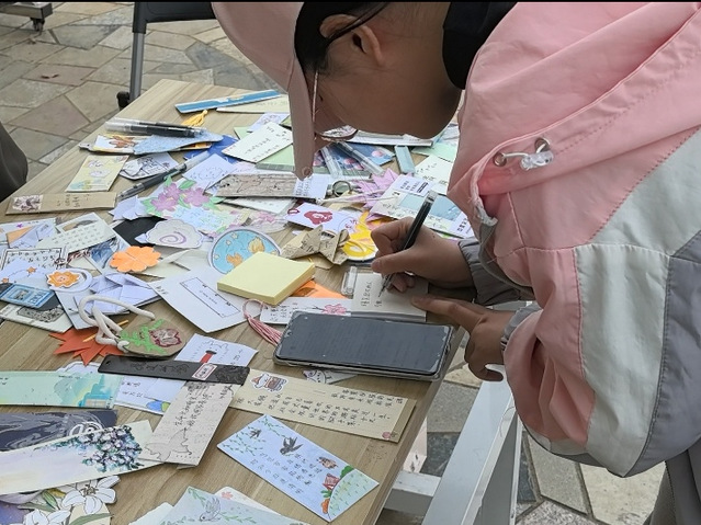书签制作区,墨香四溢。每一张书签,都是一段心绪的承载,或书法点染,或丹青晕染,寄托着创作者对清明的理解与情感。“这张书签上的诗句是‘风雨梨花寒食过,几家坟上子孙来’,看了让人很有感触。”一位同学轻轻抚摸着书签上的字迹,低声说道。另一张书签上,则是青绿山水,烟云缭绕,仿佛再现了古人踏青郊游的场景。“清明不仅仅是悼念,它也是春天的节气,是生机勃勃的季节。”同学们将亲手制作的书签互相交换,彼此间的交流不仅是艺术的分享,更是情感的流动。