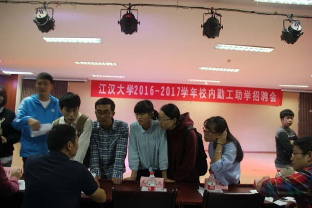 9月29日下午,由我校学生处学生资助管理中心组织的“江汉大学2016-2017学年校内勤工助学招聘会”在师生活动中心举行。本次招聘会共有校内30余个行政部门和附属单位参加,提供221个勤工助学岗位,吸引了近500余名同学前来应聘。