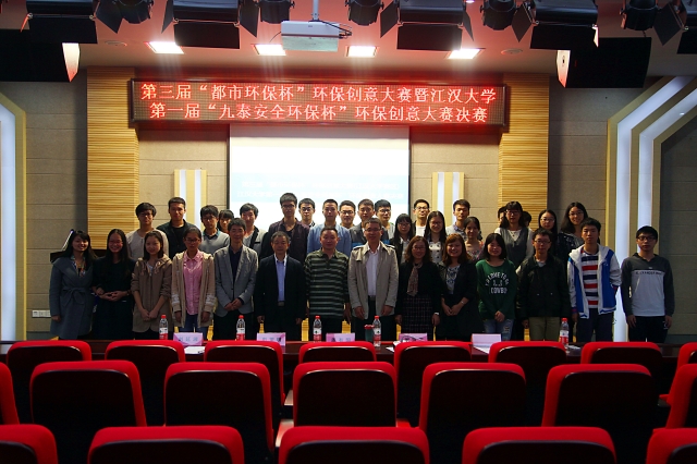10月15日下午,第三届“都市环保杯”环保创意大赛暨江汉大学第一届“九泰安全环保杯”环保创意大赛在江汉大学J13报告厅成功举行。出席本次决赛的专家评委有九泰公司周有国经理,江汉大学团委副书记程烜,化学与环境工程学院副院长彭望明,副院长刘琼玉,环保专业教授刘延湘。