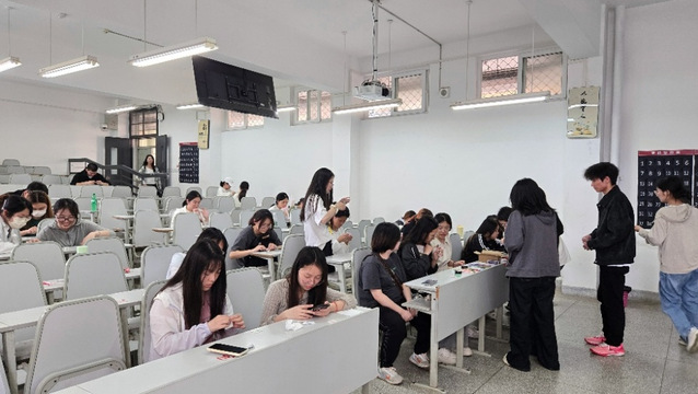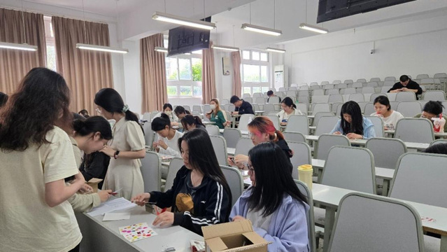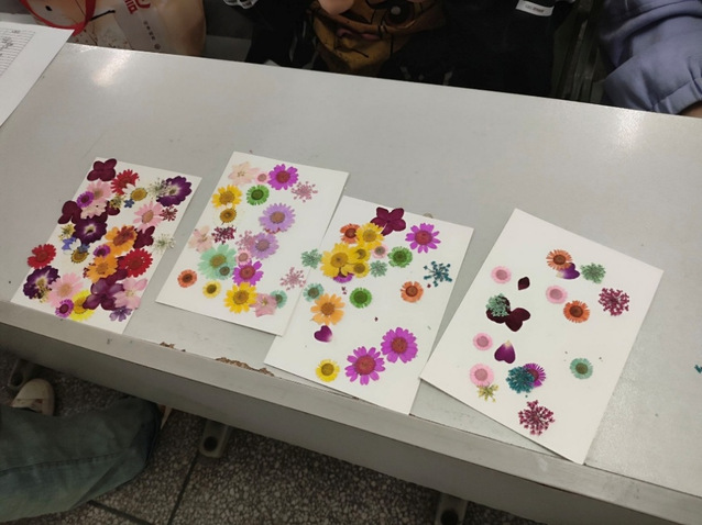 在第一排的材料分发区仔细挑选完干花,同学们回到座位上,正式开启属于自己的创意征程。一时间,教室里满是专注投入的神情,大家构思着独一无二的图案与布局,随后将干花嵌入书签纸中。有的同学小心摆弄干花,反复调整位置,只为追求最完美构图;有的同学与身旁伙伴轻声交流,思维碰撞,分享创意灵感。志愿者们也忙碌不停,为同学们答疑解惑、提供帮助。在此过程中,每一片干花都被注入全新生命力,每一张书签都渐渐化作同学们内心世界的独特写照。
