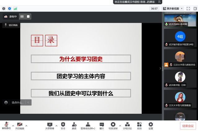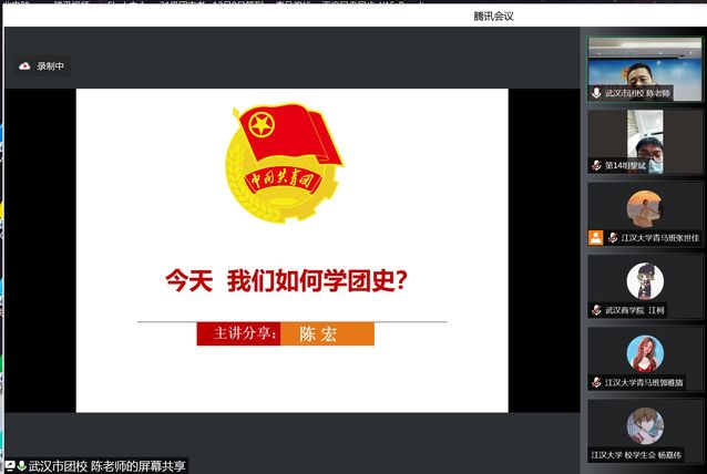 在此背景下,为契合时代主旋律,激发全校师生爱党爱国爱团热情,江汉大学携手武汉市其他四所高校326日上午共同举办了“今天,我们如何学团史”线上“青马工程”培训活动,五所高校共计近300名青马学员参加了此次线上培训。这是我校2022年“江大之春”校园文化节的要活动之一,也是我校首次与其他高校共同举办青马班线上学习交流。