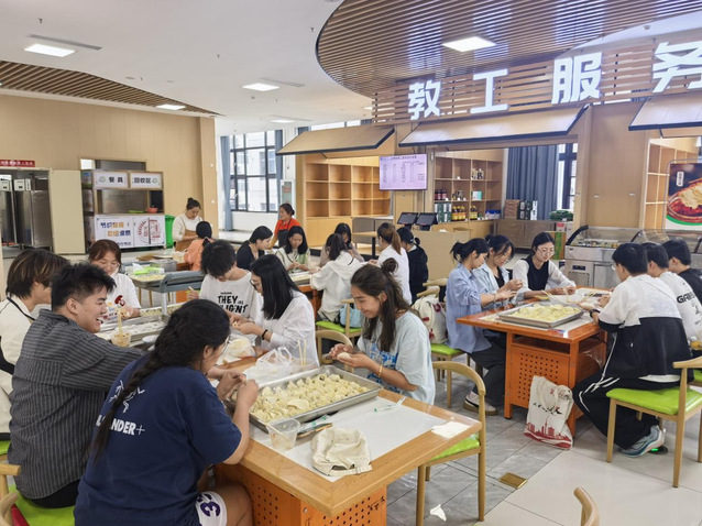 活动现场热闹非凡、暖意融融。同学们围聚餐桌,目光紧紧追随食堂工作人员手中的饺子皮与馅料。工作人员细致入微地示范包饺子技巧,边讲解边操作:“先将饺子皮置于掌心,舀入适量馅料,再双手轻合,捏出褶子……”在手把手的指导下,同学们跃跃欲试,纷纷开启包饺子的劳动实践之旅。