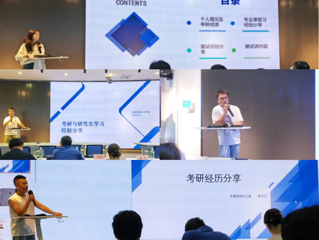 在分享环节,五位成功上岸的校友分别从不同视角带来极具实操性的考研指导。就读于中国科学院水生生物研究所读博一的陈文俊结合自身考研经历,系统梳理备考全流程,从院校定位、专业方向等宏观策略,到参考资料选择、每日学习计划等微观执行层面,均给出良好建议。来自湖北大学研二何必玉,从自身经历讲起,将考研复习安排和复试经验倾囊相授,为同学们认真介绍了复习规划和复试注意事项。即将前往武汉理工大学攻读博士的叶子琪以自身考研历程为例,消除了大家对研究生生活的迷惑,增强了大家对考研的希望和信心!今年已被华中科技大学录取的邹定正同学,强调发挥好自身优势和确定好方向的重要性,劝告同学们不要过于操心和焦虑,启发了同学们更多的思考。今年考入暨南大学的张瑞祺同学也强调了选择的重要性,同时提醒同学们要关注真题关注热点,脚踏实地,才能行稳致远。在互动交流环节,同学们积极提问,校友们耐心解答,帮助大家明晰考研目标与规划。