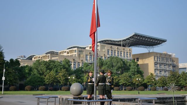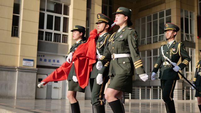 清晨7点,升旗仪式正式开始。伴随着指挥员清脆洪亮的口令,旗护卫队护旗手护卫着国旗,迈着铿锵有力的步伐走向升旗台。在雄壮激昂、催人奋进的《义勇军进行曲》中,擎旗手挥臂扬旗,鲜艳的五星红旗冉冉升起、迎风飘扬;全体师生庄严肃立,向国旗行注目礼。