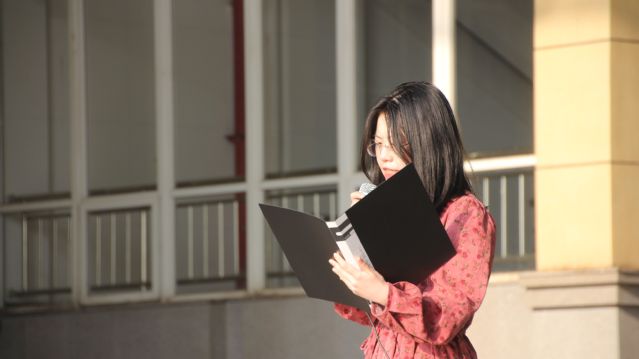 教育学院2021年校长奖学金获得者、18级应用心理学专业杨振宁同学作为老生代表,进行国旗下讲话。她分享了作为一名00后大学生,面对新冠疫情,不惧风雨、勇挑重担、奉献在前的亲身经历,她号召全体学生,要坚定理想信念,不负时代重托,不负青春韶华,用汗水印证青春,用青春点亮未来,在新时代展示青年新风采、新作为。