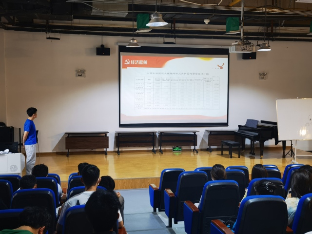此次主题教育活动由 2017级音乐教育专业学生邓初荣主讲,他主讲的主题是《投笔从戎 无悔芳华》。邓初荣同学2019 年9月入伍,2021年7月退伍复学,他向学生们讲述了他入伍2年在驻港部队的生活和入伍期间的心路历程。另外,他还跟同学们分享了入伍的意义及相关政策,强化同学们服兵役的责任感和参军保卫祖国的意识。21级莫翼杨同学听完之后表示,第一次这样清晰的了解当兵的政策,今后有机会也想征兵入伍,去体会一下军营的生活。