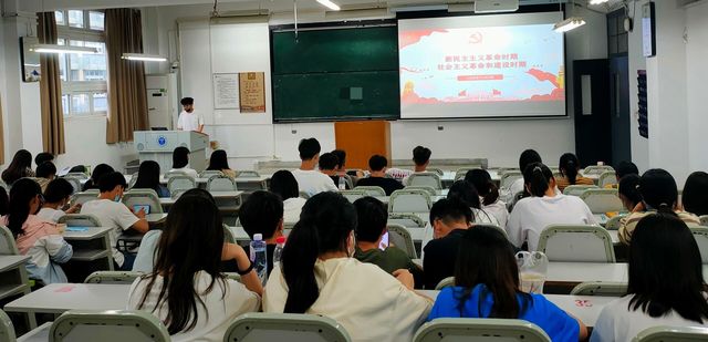 首先,学生党员肖好同学以时间主线为轴,讲述了中国共产党在新民主主义革命时期、社会主义革命和建设时期的光辉历程。他带领学生们分别从1921年7月,嘉兴南湖之畔的开天辟地——中国共产党的成立到1978年社会主义革命和建设时期在中国共产党的领导下我国所取得的历史成就,其中孕育出来伟大建党精神和红船精神等,更是激励着我们青年不忘初心,牢记使命,为建设中国特色社会主义而努力奋斗!
