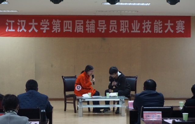 决赛分为主题班会策划和谈心谈话,3月6日下午在师生活动中心101报告厅举行。相关职能部门领导、学工部校团委领导、学院分管学生工作的副书记担任评委,全体辅导员到场观摩比赛,各学院学生代表为参赛辅导员加油助威。在班会策划环节,参赛人员采用PPT汇报的方式,阐述班会的主题与目的、前期准备、具体内容及组织形式等。谈心谈话环节,采取现场抽题,根据题目要求,以情景再现的方式开展谈心谈话。由我校大学生艺术团的同学进行角色扮演,参赛人员针对题目中给定的学生在学习、生活、情感等方面出现的问题或存在的困惑,与学生进行现场谈心谈话。这一环节重点考察辅导员的工作态度、工作方法、心理素质、处理突发事件的应变能力等。