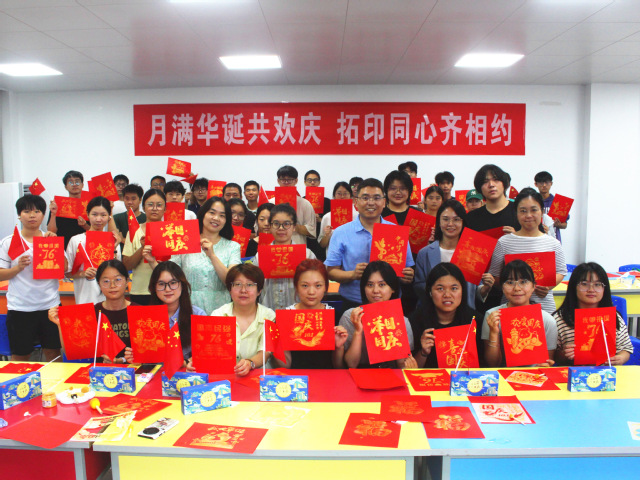 温情不止于拓印。活动现场,学校精心准备的江大“品月”专属月饼同步分发,香甜的口感不仅传递着节日的问候,更让来自五湖四海的学生感受到学校与学院的关怀。当一张张带着墨香的拓印作品晾干成型,现场师生手持鲜红的国旗与自己的拓印成果,共同高呼“祝祖国繁荣昌盛!祝大家双节快乐!”,嘹亮的祝福声里,满是对祖国的深情与对团结的珍视。