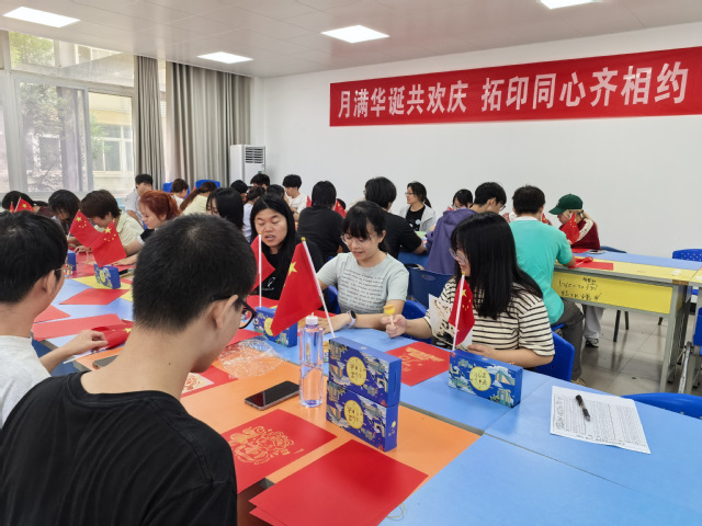 活动中,学生党员主动发挥先锋模范作用,与少数民族学生代表结对合作,共同完成拓印作品。来自布依族学生周加贽一边小心翼翼地用拓包蘸取墨汁,一边笑着说:“这是我第一次体验拓印,和同学一起印出‘祖国万岁’的字样时,心里特别激动。这种亲手创作的祝福,比任何礼物都珍贵,也让我感受到了大家庭的温暖。”学生党员袁旭则与同伴一起,将中秋明月与国旗元素融合在同一张拓印纸上,“双节同庆,既有家的团圆,也有国的荣耀,这张作品我要好好珍藏。”