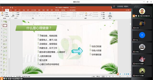 9月7日晚7点,学院组织开展“新起点 心开始”线上讲座。此次新生入学教育专题讲座由我院学办主任、心理辅导员李慧中老师主讲,2022级新生辅导员及400余名新生共同参加。讲座伊始,李老师以趣味心理小测试,充分调动起学生们的互动参与热情,并以大一新生进入大学可能面临的人际交往、恋爱关系、学业压力等问题为出发点,教授心理自助的技能。通过丰富的案例描述了大学生常见的焦虑、抑郁情绪及所带来的不良影响,针对日常生活中遇到的各种压力,提供了一系列行之有效的消除负面情绪的方法。最后,李老师向同学们详细介绍了学校心理健康教育中心以及学院心理健康工作站的咨询求助方式,鼓励同学们充分利用学校资源提高自身心理健康水平。