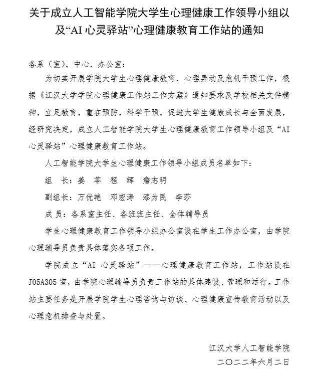 为扎实推进学院心理健康教育工作,落实“三全育人”目标任务,人工智能学院积极响应校心理健康教育中心关于创建院级心理健康教育工作站部署,按照《江汉大学学院心理健康教育工作站工作方案》要求,成立学院心理健康教育工作站“AI心灵驿站”,旨在提升心理健康教育工作实效,服务大学生健康成长。