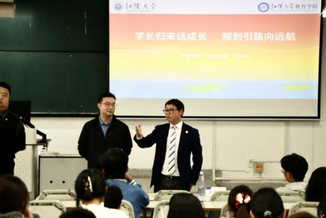 时光淬金,情谊不改。金秋十月,共话同窗情。10月18日上午,江汉大学“校友回归”暨“校城融合”高质量发展大会于学校科创大楼江大厅召开,教育学院近20名校友自全国各地重返母校,与师生共赴校地发展盛会。下午,教育学院邀请优秀校友为学院2025级新生开展了以“学长归来话成长,规划引路向远航”为主题的“学长归来”分享会,方河俊、邵胜强、赵千、万敬兵四位优秀校友以“成长导师” 身份传经送宝,助力在校学子明确成长方向、做好学业与职业规划。