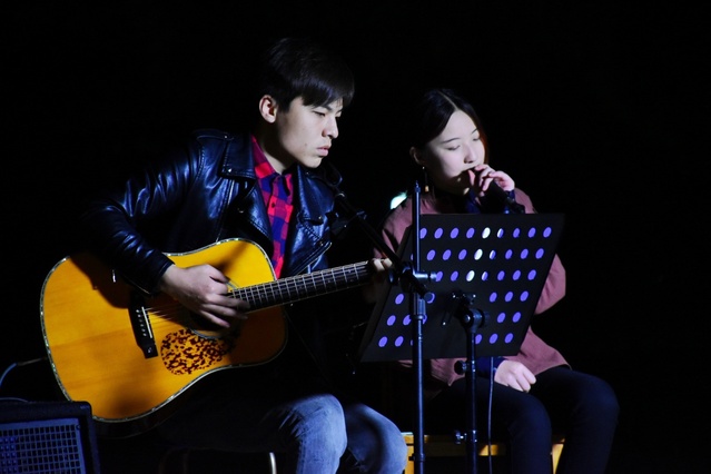 五月初夏,三角湖畔微风正凉,晚7时许,吉他爱好者协会会员陆续集合于三角湖畔的英才广场,摆开琴架、音箱等设备开始各自准备,为后面的展示表演做着最后的调整;他们有的自弹自唱、有的调试设备、兴之所至,有的社员还自发地练起了自已创作的歌曲。随着夜课铃音响起,展示表演以一曲低吟浅唱般的《奇迹的山》开始,吉协会员们以精湛的琴技先后演绎了《晴天》、《理想三旬》、《少年锦时》等众多经典吉他曲目。吉协带来的十多首民谣歌曲,或轻柔舒缓,或激越高亢,吸引过路同学纷纷驻足聆听,有一些同学还专门向会员们询问感兴趣曲目的名字。近9时,一曲《海阔天空》将展示演出气氛推向高潮。最后,展示表演活动圆满结束,同学们意犹未尽。
