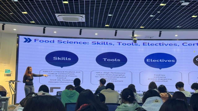 萨拉教授深耕动物行为学与动物福利研究多年,拥有丰富的学术与行业经验,曾荣获中国政府友谊奖、意大利之星骑士勋章、国际工程技术协会(IETI)杰出会士等多项重要荣誉,此次讲座她以“生命科学领域的多元机遇”为切入点,系统拆解了行业发展全景。她指出,生命科学已形成食品科学、生物技术、植物科学、生态学四大核心领域,且各领域间存在深度交叉融合,为从业者提供了广阔的职业选择空间。