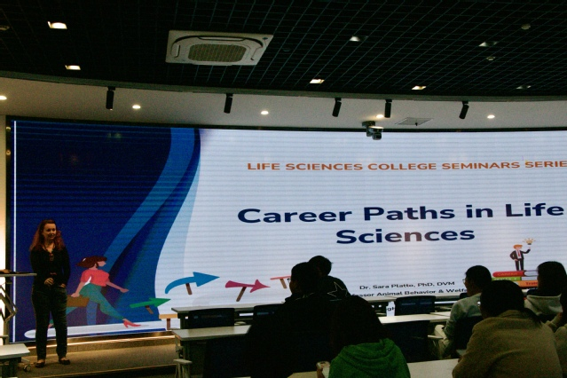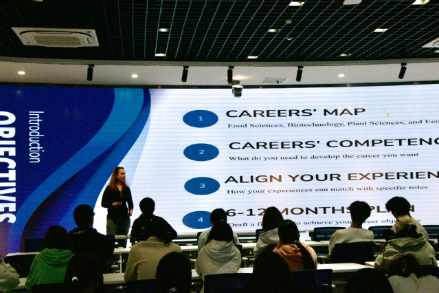 2025年11月12日在J12A109江汉大学生命科学学院特邀外籍教授萨拉・普拉托(Sara Platto)开展“生命科学职业道路”专题讲座。讲座围绕职业路径规划、核心能力培养、经历整合与短期目标设定四大核心模块,为现场大一新生带来了兼具专业性与实用性的职业发展指南,助力生命科学领域学子明确成长方向。