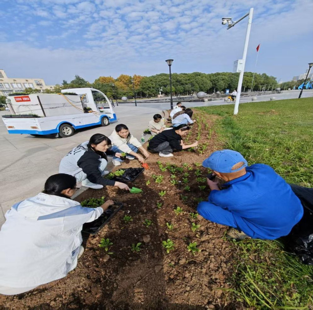 活动现场,青春身影与草木绿意相映成趣。18名志愿者在园艺师傅和学院专业教师的指导下分组协作,有的轻托植株护住完整土球,有的依据植物生长特性校准土坑深度,有的手持小铲分层填土压实,每一个动作都透着科学严谨的专业态度。这场景让人想起学院劳动教育实践基地里,学子们挖红薯、种蘑菇时的专注神情,无论是花坛移植还是田间耕耘,都彰显着生科学子将理论知识转化为实践能力的扎实成效。