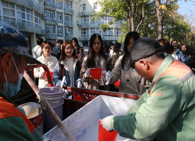 同学们分组协作,拎桶、蘸刷、涂抹有条不紊,严格遵照示范标准作业。即使石灰浆溅到手套和衣袖上,大家依旧干劲十足,现场一派热火朝天的劳动景象。经过近两小时劳作,百余棵树木整齐穿上“白裙”,成为校园冬日里一道靓丽风景线。