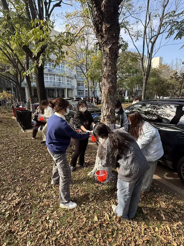活动开始前,生命科学学院蔡老师首先强调了实践的纪律与安全注意事项:“作业时需保持安全间距,避免石灰浆溅入眼睛;工具使用后要及时清理,统一归还。”随后,后勤绿化师傅现场分发水桶、刷子和防护手套,并细致示范操作流程:“蘸浆要均匀,刷涂时从树根向上至1.2米处,做到涂层平整、无漏刷、不流淌。”师傅还补充了树木刷白的科学原理——石灰涂层能反射阳光、减小昼夜温差防冻裂,同时可杀菌杀虫,为树木安全越冬筑牢屏障。