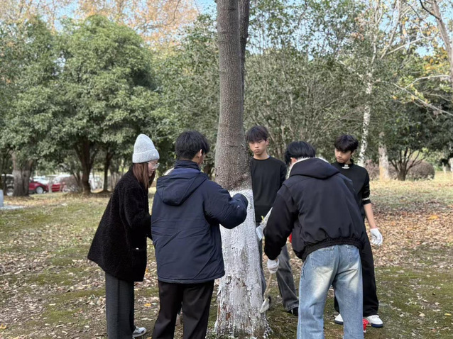 2025年11月20日下午,江汉大学音乐学院2025级学子走出琴房,化身“校园护绿使者”,在校园主干道两侧开展树木刷白劳动实践活动,用双手为校园树木披上冬季“防护衣”。