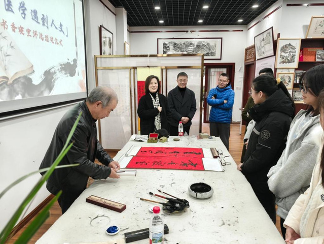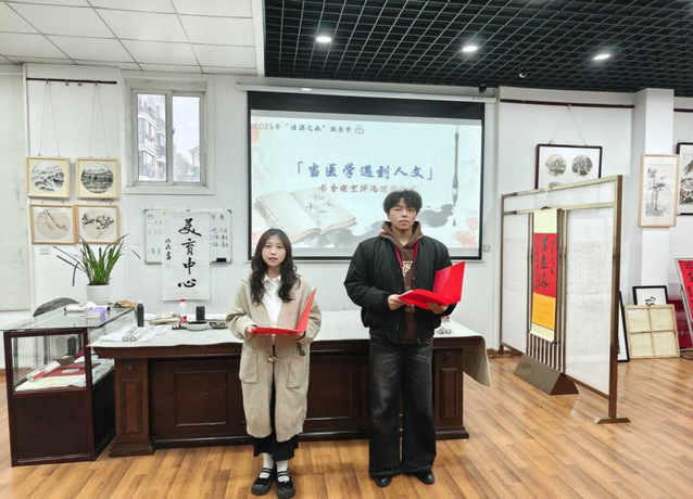 随后,学生代表怀着感恩之心,向校关工委书法老师们献上两份特殊礼物——亲手制作的中医药香囊与学子参与编撰的《武汉院士口述录》。香囊氤氲着传统医药的清香,书籍记录着科研前辈的初心,这份跨界融合的心意,恰是“医学遇人文”的生动诠释。紧接着,同学们以一首深情的《水调歌头》诗歌朗诵,倾诉对老师们关心关爱下一代成长的真挚谢意,悠扬的语调在现场久久回荡。