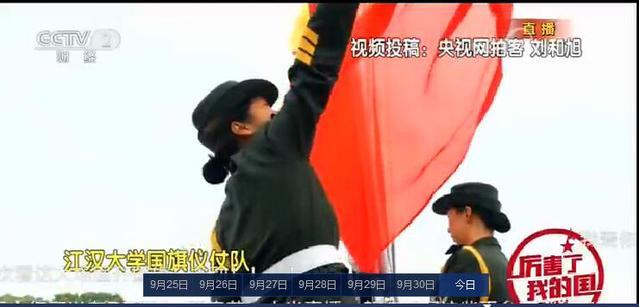 十月一日,中央电视台财经频道连续组织13小时《厉害了,我的国》全国直播大接力。早上6点15分播出记录我校国旗仪仗队的电视纪录片《我们的国旗》,庆祝中华人民共和国成立68周年。该片由江汉大学党委宣传部指导出品,星河影视制作完成。江汉大学,迎着日出升国旗,莘莘学子,青春风采映朝霞。