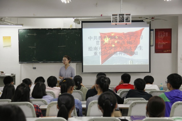 为了全面贯彻落实习近平总书记给南开大学新入伍大学生重要回信精神,2017年9月29日晚6时30分,化学与环境工程学院开展了以“学习习近平总书记的重要回信精神”为主题的班会活动,参加人员主要为17级学生与17级辅导员翟后铭。