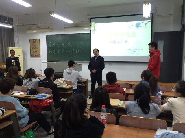 18时30分,张校长来到J01教学楼,走近自习室,听到室内有学生在发言,同时伴随着阵阵掌声。正值商学院开展“喜迎十九大·向党说句心里话”主题团日活动。张校长饶有兴致地从后门进入教室,坐下来听了几名同学的发言,并称赞主题团日活动很有意义,认为刚进校不久的同学参加这类活动,主动走上讲台,敢于表达自己的想法,是一种很好的锻炼。他希望同学们尽快适应大学的学习生活,大学期间不仅是学习知识,更重要的是掌握学习方法,同时还要扩大视野。学校将突出强调“应用性、创新性、国际性”的人才培养模式,将为大家的成长创造更好的条件。