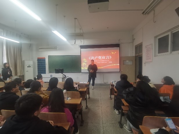 第一位进行经典分享的是杨舒琪同学,他品读的原著为:《共产党宣言》,杨舒琪同学从书的写作背景、内容简介两个方面进行分享,他认为:《共产党宣言》作为第一次全面阐述科学社会主义原理的伟大著作,矗立起一座马克思主义精神丰碑,是中国共产党百年辉煌的思想之源。在分享的最后,他有激情的诵读了书中最经典的那句话:一个幽灵,共产主义的幽灵,在欧洲大陆徘徊。为了对这个幽灵进行神圣的围剿,旧欧洲的一切势力,教皇和沙皇、梅特涅和基佐、法国的激进派和德国的警察,都联合起来了!