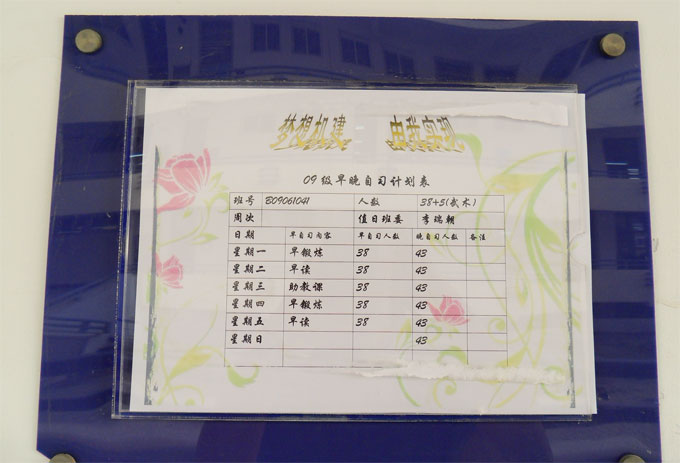 新学期伊始,机建学院为建设良好学风,抓好08,09级学生早、晚自习、早锻炼的工作,学院组织各班所有同学做好个性化的晨读晨练计划,统一制定详细表格,使大家更加有计划有效果的学习和锻炼。 同学们也积极按照自己的实际情况,合理地分配晨读晨练晚自习时间。 由于08级学生晚上有选修,学院制作了表格,详细地登载记录每位同学的晚自习计划,督促同学们认真利用好晚自习学习时间。
