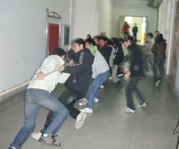 | | 2月23日上午7:20,在医学院J12中庭传出的加油声不绝于耳。此时, 08级全体学生正在开展一场声势浩大的拔河比赛,由此拉开了下学期的晨练序幕。