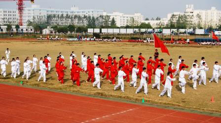 | | 弘扬中华传统文化,以武会友健体强身,促进校风学风建设,江汉大学首届武术比赛的预赛于10月22日在田径场如期举行。学生处领导张焰副处长出席比赛,并担当评委。15个参赛队伍各选出六十人组成一个方阵,寓意着为祖国六十华诞贺寿。比赛当天艳阳高照,各支代表队精神抖擞,以三个方阵为一组,分成五组进行预赛。