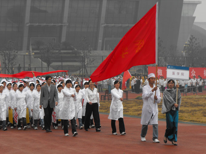 随着运动会入场式音乐旋律响起,各院的仪仗队首先入场。医学院仪仗队衣着整齐的白大褂,手举着红十字缓缓的向主席台迈进,到达主席台,嘹亮的口号声响起“健康所系,性命相托,医界精英,与国辉煌”,口号声刚落,队伍上方便出现了“热烈祝贺建国六十周年”的大字,队伍走出主席台时,礼花射向空中,大家都被这新颖的创意所感染,全场一片沸腾。外语学院和艺术学院在服装造型上下足了功夫,那一身身帅气的牛仔装,一袭袭婀娜多姿的旗袍装着实让人眼前一亮,大饱眼福。