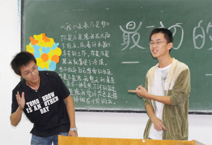 “``````最初的梦想紧握在手上,最想要去的地方,怎么能在半路返航,最初的梦想绝对会到达``````”大学,寻梦的舞台,追寻着最初的梦想,我们相聚在大学。10月23日晚,伴随着范玮琪《最初的梦想》优美的旋律,数计学院09级软件班“最初的梦想”主题班会在J04B104自习室里激情上演,党委副书记兼软件班班主任周汉平老师和09级辅导员李珍华老师亲临现场,观看了同学们主持的深情、精彩的班会。 主题班会形式多样,内容丰富,吸引不少同学观看。歌曲《最初的梦想》、《水手》,诗朗诵《理想》,游戏《吹蜡烛》、优点轰炸,相声《我要奋斗》,博得了在场的一阵阵欢呼,深情感人的亲情连线环节,在场同学的父母通过电话,对自己孩子的大学求学给予的期望,感情自然真情的流露,打动了在场的所有人,也鼓励了更多的人,去追逐自己的梦想的决心``````最后在大合唱《我的未来不是梦》中,班会完满结束。