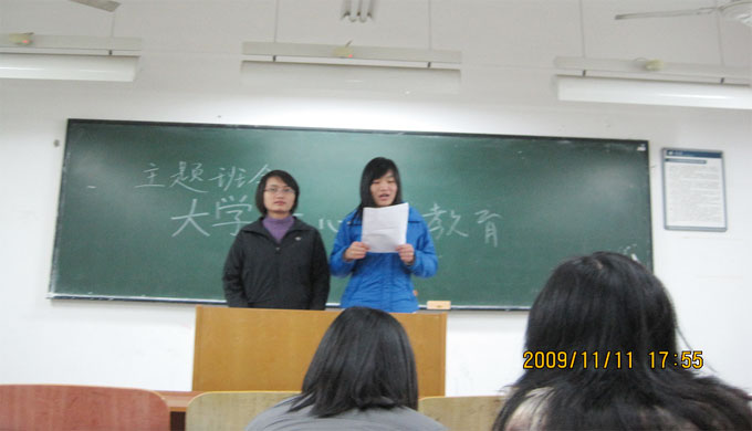 商学院09旅管班于2009-11-11在J01B101教室开展了一次以“大学生心理健康教育”为主题的班会活动。