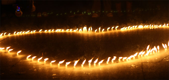 11月24日晚上6点30分,数计学院特研会举办了纪念长江大学就人英雄烛光追思会,此次活动由特研会会长刘咏芳主持,大一辅导员李珍华和09级新生参加了这次活动。 在英才广场上,同学们点燃手中的蜡烛,围着被烛光点亮的爱心。在烛光的照映和音乐的飘扬下,我们组织了十八人梯的诗歌朗诵,纪念在10月24日为救两名落水小孩牺牲的三名长江大学的大学生何东旭、陈及时和方招。 当我们在广场上点燃蜡烛时,吸引了很多的来往的同学,并且一起参加这次“烛光追思会”。烛光照映着同学们虔诚的脸庞,我们就在这一片烛火下为牺牲的三位大学生默哀一分钟。他们的精神一定会得到延续,爱心一定能传播的更远。
