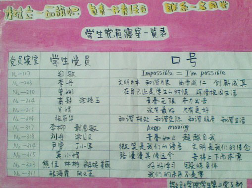首先,要求全体学生党员递交自己的座右铭,同一寝室党员综合自己寝室口号,然后统一制成海报张贴在北一、北二两栋寝室楼。