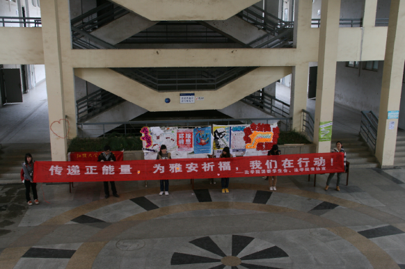 在活动现场,法学院青年志愿者协会展示了“为雅安祈福,我们在行动”的主题板报。展板内容不仅反映出灾区人民抗击地震的坚强与全国各地八方支援的爱心,更有法学院12级学生在板报上的便利贴上写下的“加油,雅安”、“挺住,雅安”等鼓励雅安坚强的祝福语。每一条祝福代表着一份诚挚的爱,聚爱共献雅安。活动最后每个人都在横幅上签名,粗重的字体在指尖流出,庄重的神情在脸上呈现,大家通过传递正能量,希望在遥远的雅安同胞能战胜灾难,坚强站起。