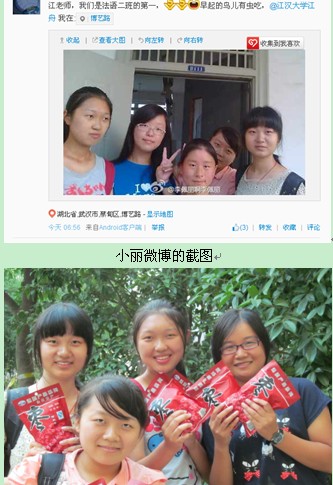 “老师,早自习我们是第一……”这是在大学正式开课第一天的早晨,由江汉大学外国语学院新生小丽发出的一条微博,在微博里她还配上了她和同学站在教室门口的一张自拍照。