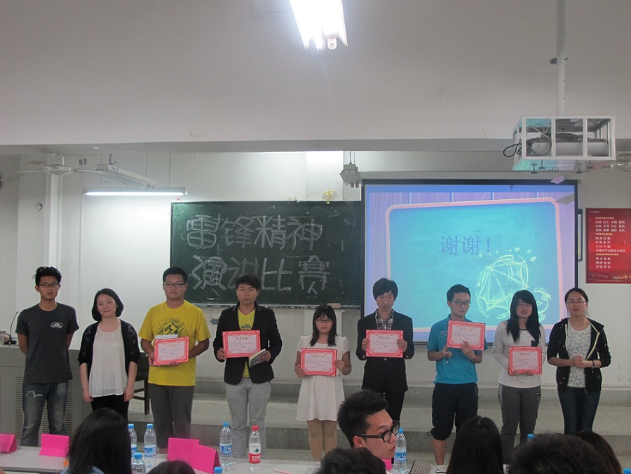 为更好的学习雷锋精神,在实践中传承雷锋精神,4月27日晚八点,化环学院团学联学习部在学院A106教室举行了“弘扬雷锋精神,雷锋在我心中”的主题演讲比赛决赛。 邀请了雷锋精神研究会前会长梅雅如学姐以及团学联主席吴�学长担任本次比赛评委