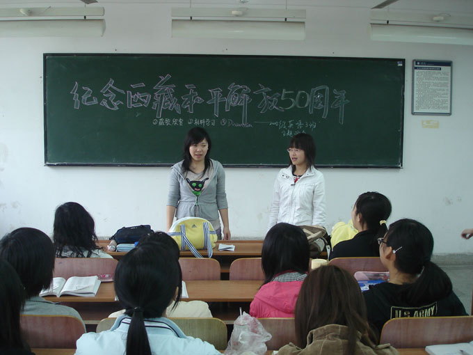 今年是庆祝西藏民主改革50周年,为了进一步加强学生的民族精神教育,帮助广大学生牢固树立马克思主义的国家观、民族观,外国语学院08级开展了主题为“看西藏巨大变化,增民族团结意识”纪念西藏民主改革五十周年活动,围绕主题通过各种形式在学生中开展爱国主义教育。