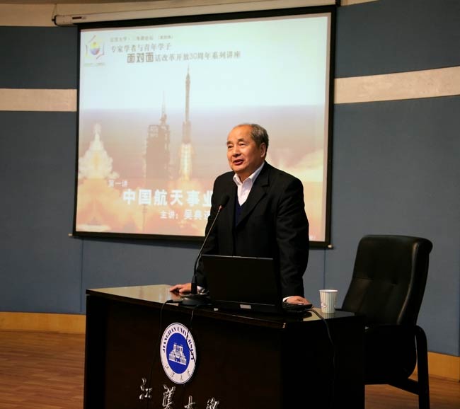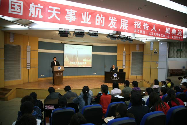 报告图文并茂,内容翔实,讲授生动,令全场学生大开眼界、大饱耳福,同学们感到受益匪浅并为我国航天业的发展备受鼓舞,一致认为吴老既向大家宣传了中国航天事业改革开放的成果,又给同学们上了一堂生动的航天科普知识课,更让江大学子明白了“特别能吃苦、特别能战斗、特别能攻关、特别能奉献”的航天精神。