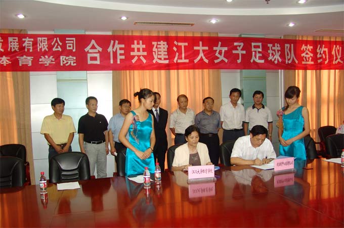 9月16日下午3:30,在江汉大学行政楼217会议室举行了“武汉体育中心发展有限公司与江汉大学体育学院合作共建江大女子足球队签约仪式”。 签约仪式由校长杨卫东同志主持。武汉体育中心董事长易国庆和武汉江大女子足球队俱乐部负责人王超英教授在协议书上签字。两位负责人签字完毕交换协议书,全场一致鼓掌,预祝双方合作成功。