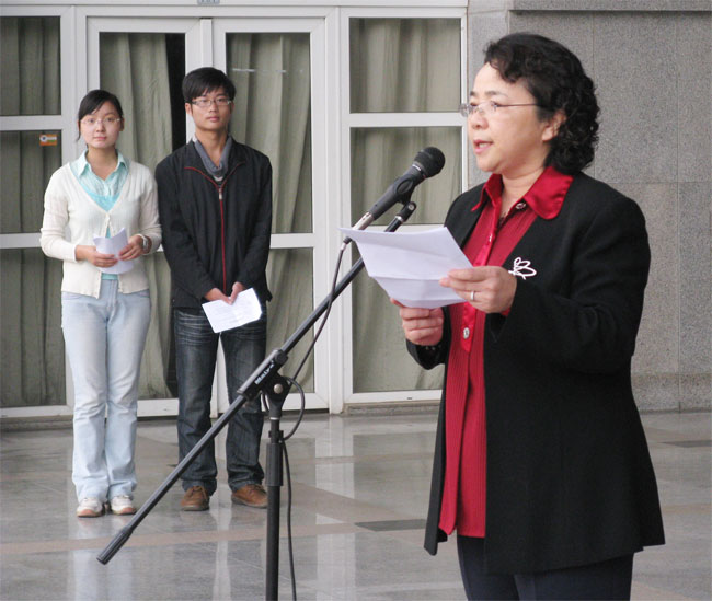 人文学院中文071班韩金玲同学代表全体学生做国旗下讲话。她讲述了自己大学两年学习、生活的艰辛,希望同学们珍惜学习机会,努力学习。她说:“大学四年,我们不仅要学习知识,还要学会奋斗,勇敢面对生活的挫折。”同时她还感谢一直关心和帮助她的学校领导、老师和同学。