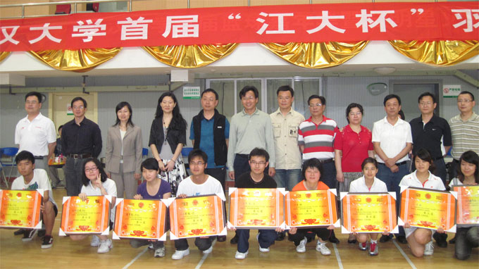 | | | 2010年5月27日在江汉大学体育馆举行的2010年江汉大学首届“江大杯”羽毛球团体比赛落下帷幕。获得此次大赛团体甲组09级前三名分别是:高尔夫学院、外国语学院、生科学院;08级前三名分别是:医学院、人文学院、商学院;07级前三名分别是:外语学院、化环学院、物信学院。乙组(体育学院)的前三名分别是:07体育保健、07体育教育、08体育教育。