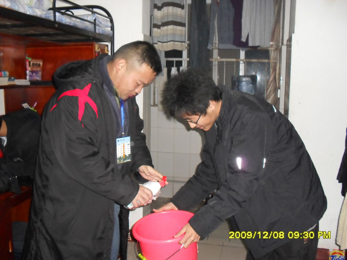 | 为执行校学生工作部(处)的指示,切实关心学生公寓入住的学生身体健康安全,北九学生公寓辅导员张晓松老师,助理辅导员吴磊、闫龙组织了学生自治巡查队督促该楼栋学生开展了宿舍卫生消毒活动。 由于天气逐渐寒冷,不时有学生发生感冒。为了预防甲流感,物信学院学办专门从校医院领取了84消毒水,提供给学生楼栋。12月2日晚,北九公寓辅导员张晓松给公寓助理辅导员、楼栋各层层长作了预防甲流感,卫生大扫除的活动动员部署,阐明了在学生公寓预防甲流感对于学生健康安全的重要意义。  2-4日,楼栋助理辅导员、自治巡查队、学生党员、各层层长分工协作,逐步组织各个宿舍用84消毒水作了宿舍清洁卫生,并保持了宿舍的有效通风。