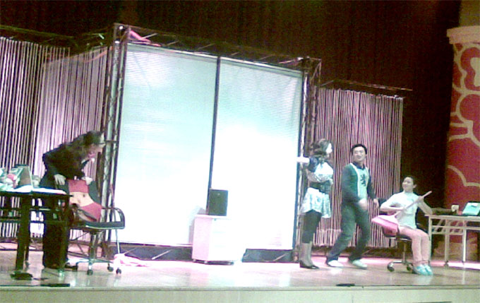 ―人民剧社江大巡演首场圆满落幕 在这家名为“能力有限”的公司里,有着踏实勤恳的小美,努力为未来努力的小何,来自农村却整日浓妆艳抹为在城市立足的丽丽,和家境优越的实习生欧吉。他们来自不同的家庭,受过不同的教育,共同的则是每天在同一间办公室里为他们抠门的裴(赔)总工作着。公司的业绩问题总是让裴总为发员工工资而发愁,而员工们也有着自己的小算盘,工作的积极性自是不高,总是吵着要跳槽,同时小何和欧吉的爱情也在悄然滋长。全剧以裴总的情感变化为主线,在“死神”―汤姆的改造下,裴总由原来的死板抠门转变为体贴员工的模范老板,他们“能力有限公司”也重新开张大吉,最终以人性的真善美打动大家。 演员们的生动演绎博得了观众的阵阵欢笑和掌声,相信这是对他们最大的肯定吧!演出结束后,校长杨卫东、副校长邓院方、校办主任邵红、校团委书记杨光敏亲切慰问了全体演职人员并和他们合影留念。他们在江大巡演的首场便取得了如此大的成功,相信接下来的两场演出会伴随着更多期待吧!让我们共同期待今晚艺术学院的再次相逢。