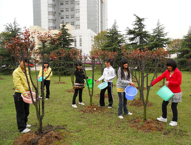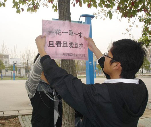 在商学院组织的“志愿服务行动活动”中,09金融团支部的同学们积极参与,并取得了突出表现,获得了老师和同学们的高度认可。 其次是环保护绿志愿小分队在美丽的江大校园行动开来。同学们提着各色的桶在诗香苑门口和一鸣桥上浇树、浇花,形成了一道美丽的风景。 还有一部分同学把09金融团支部制作的号召大家参与到环保护绿活动中来的特色宣传标语系在显眼的树上。 最后一个活动是义务清洗绿色自行车小分队开展的,他们利用课余时间,提前和二号门前的绿色自行车站台工作人员沟通好,自带工具就秩序井然的开动起来。每一位小分队同学的胸前都佩戴着中国志愿者的胸章,闪闪夺目的光辉是那么耀眼,映照在每一位志愿者的心中。